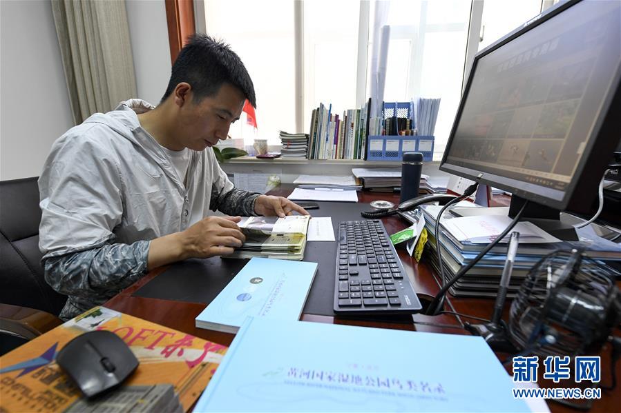 6月3日,李學(xué)明在學(xué)習(xí)鳥(niǎo)類(lèi)知識(shí)。新華社記者馮開(kāi)華攝。