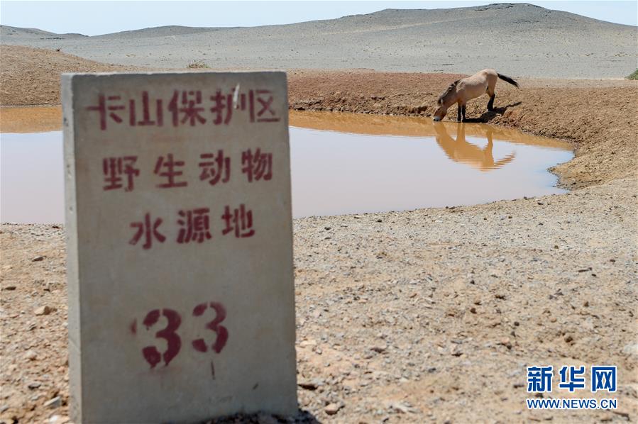 在新疆卡拉麥里山有蹄類(lèi)野生動(dòng)物自然保護(hù)區(qū),一匹普氏野馬來(lái)到33號(hào)水源地飲水(6月3日攝)。新華社記者丁磊攝。