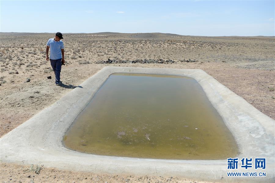 在新疆卡拉麥里山有蹄類野生動(dòng)物自然保護(hù)區(qū),管護(hù)員阿達(dá)比亞特來(lái)到人工建設(shè)的水池查看蓄水情況(6月3日攝)。新華社記者丁磊攝。