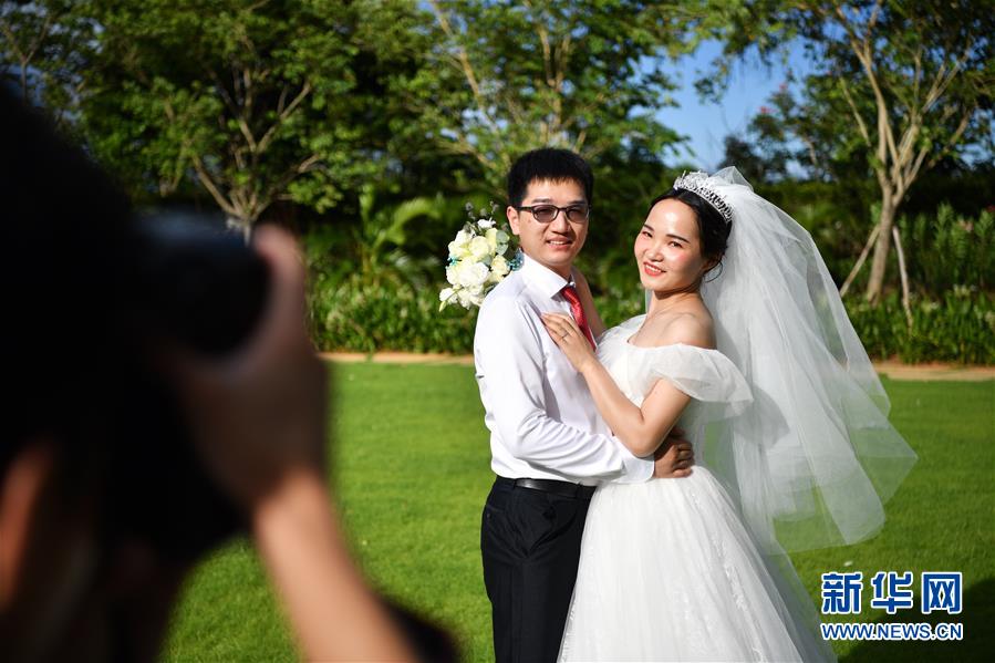 6月6日,武漢大學(xué)人民醫(yī)院護(hù)士柯全和喻晨(右)在三亞亞特蘭蒂斯度假區(qū)拍攝婚紗照。 當(dāng)日,來自全國15個(gè)省份的百對(duì)新人在三亞市亞特蘭蒂斯度假區(qū)舉行了一場(chǎng)特殊的集體婚禮,每對(duì)新人中至少有一位參與過抗擊新冠肺炎疫情的工作。 新華社記者 郭程 攝