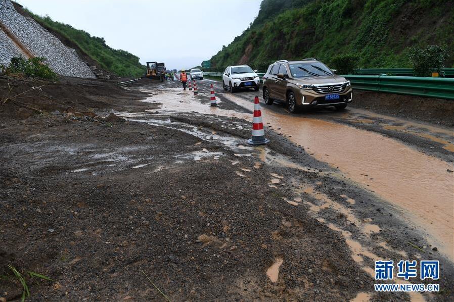6月7日,在廣西鹿寨至陽朔的高速公路上,車輛從一處發(fā)生滑坡的路段經過。新華社記者陸波岸攝