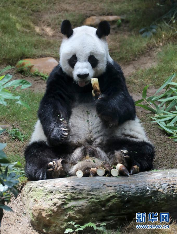 在香港海洋公園,大熊貓“安安”坐在小山坡上吃竹葉團(5月11日攝)。新華社記者吳曉初攝