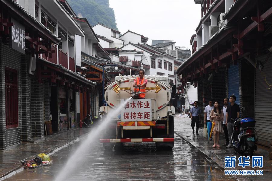 6月8日,在廣西陽朔縣西街,環(huán)衛(wèi)工人在沖洗被洪水浸泡的街道。6月6日至8日,廣西陽朔縣普降暴雨,局部降特大暴雨,全縣9個(gè)鄉(xiāng)鎮(zhèn)出現(xiàn)洪澇災(zāi)害。目前,全縣正有序開展災(zāi)后生產(chǎn)生活恢復(fù)。新華社記者陸波岸攝