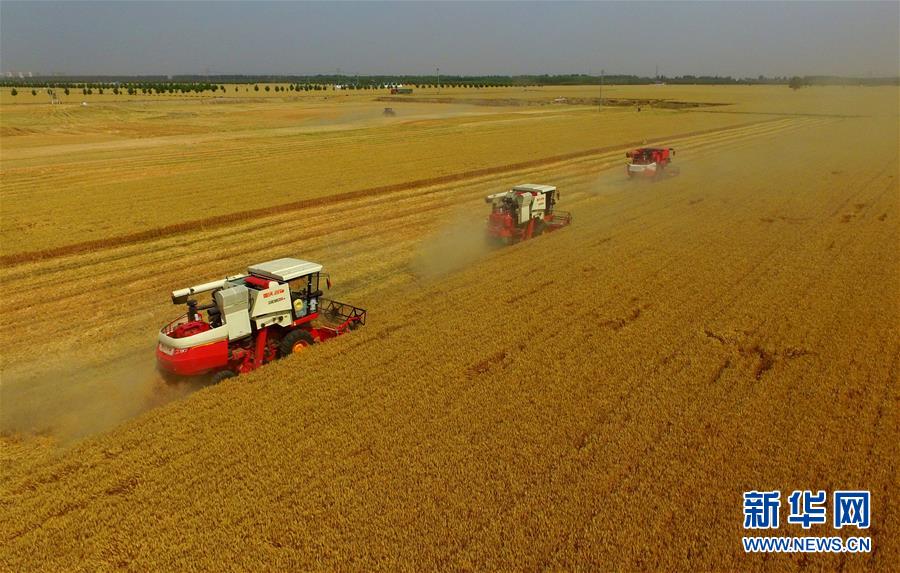 6月8日,聯(lián)合收割機(jī)在河北省南和縣閆里鄉(xiāng)閆里村麥田進(jìn)行夏收作業(yè)(無人機(jī)照片)?!叭摹逼陂g,河北省預(yù)計(jì)組織和調(diào)度小麥聯(lián)合收割機(jī)、拖拉機(jī)、夏玉米播種機(jī)等200萬臺(tái)農(nóng)業(yè)機(jī)械投入作業(yè)。新華社記者朱旭東攝