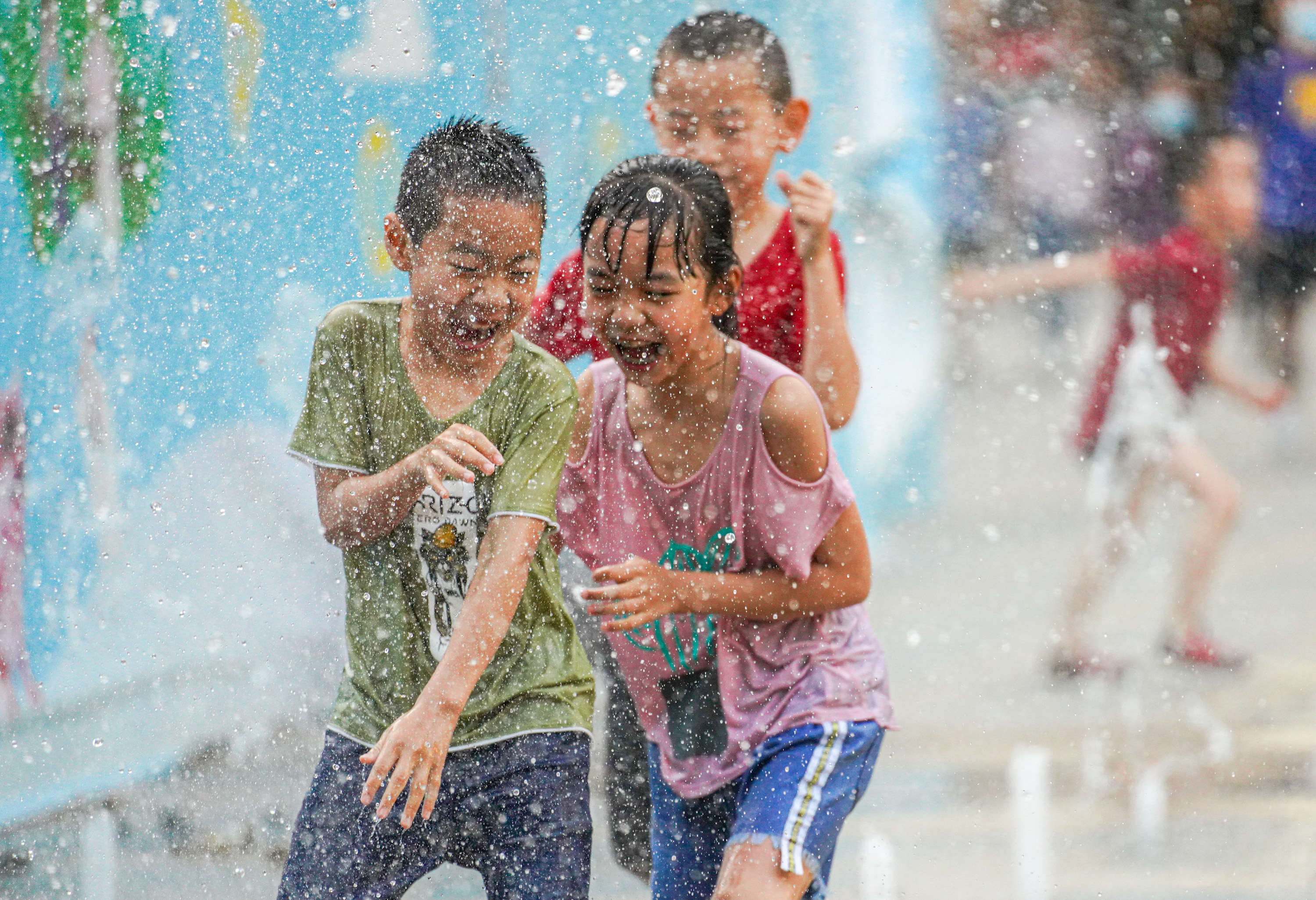 2020年6月9日報(bào)道,近期,今年以來最大范圍高溫天氣“炙烤”北方,多地高溫屢創(chuàng)紀(jì)錄,中央氣象臺已連續(xù)3天發(fā)布高溫預(yù)警,同時,高溫少雨也導(dǎo)致一些地區(qū)出現(xiàn)嚴(yán)重旱情。圖為2020年6月4日,北京三里屯噴泉廣場,很多孩子聚集在此,水中玩耍異?;鸨?。