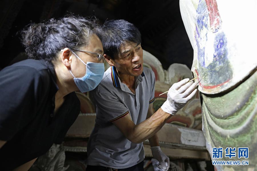 6月8日,工作人員對(duì)奉國(guó)寺的彩繪泥塑進(jìn)行保護(hù)修復(fù)。新華社記者姚劍鋒攝