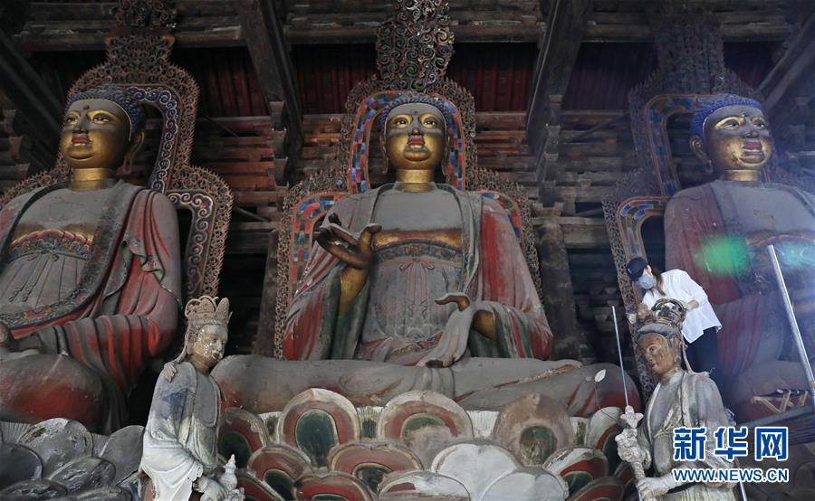 日前,建于1020年的遼寧錦州義縣奉國(guó)寺開始進(jìn)行彩繪泥塑一期保護(hù)修復(fù)工程。奉國(guó)寺?lián)碛心壳笆澜绶秶鷥?nèi)罕見的大型泥塑彩繪佛像群,于2012年被列入《中國(guó)世界文化遺產(chǎn)預(yù)備名單》。新華社記者姚劍鋒攝