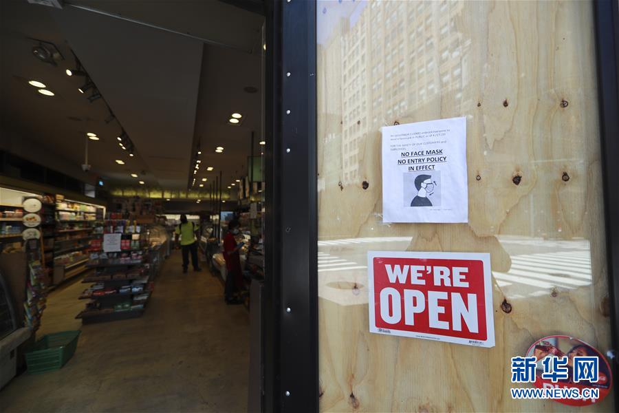 6月8日,美國(guó)紐約一家商店的門口貼著佩戴口罩方可進(jìn)入的提示。在因新冠疫情進(jìn)入“居家令”近三個(gè)月之后,美國(guó)紐約市于當(dāng)?shù)貢r(shí)間8日開始“解封”,進(jìn)入經(jīng)濟(jì)重啟的第一階段。新華社記者王迎攝