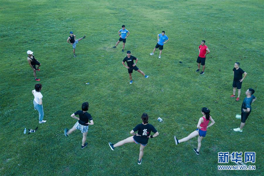6月11日傍晚,在??谌f綠園,市民在夜跑前做熱身運(yùn)動(dòng)(無人機(jī)拍攝)。近年來,夜跑成為越來越多都市人熱衷的健身方式之一。在海南???,每當(dāng)夜幕降臨,“夜跑族”來到海口萬綠園、世紀(jì)公園等夜跑場所跑步,用一身酣暢淋漓的汗水?dāng)[脫白天工作中的壓力,享受跑步帶來的歡愉。新華社記者 蒲曉旭 攝