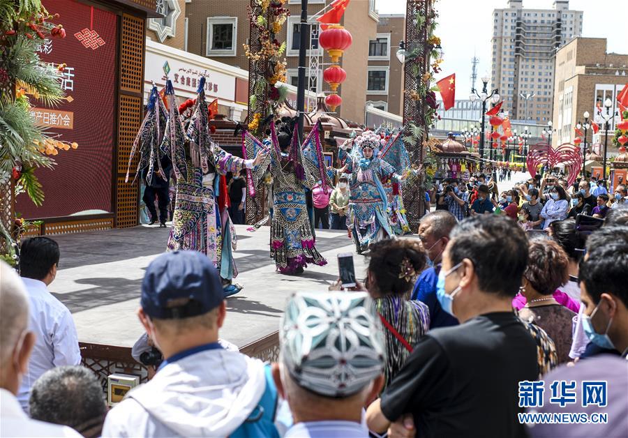 6月12日,在位于烏魯木齊大巴扎景區(qū)內(nèi)的活動現(xiàn)場,烏魯木齊秦劇團(tuán)的演員在表演國家級非物質(zhì)文化遺產(chǎn)——秦腔。6月12日,“文旅融合,文物賦彩,非遺傳承,健康生活”2020年烏魯木齊市天山區(qū)文化和自然遺產(chǎn)日推介展演活動在大巴扎景區(qū)舉辦,吸引不少游客和市民觀賞。新華社記者王菲攝。