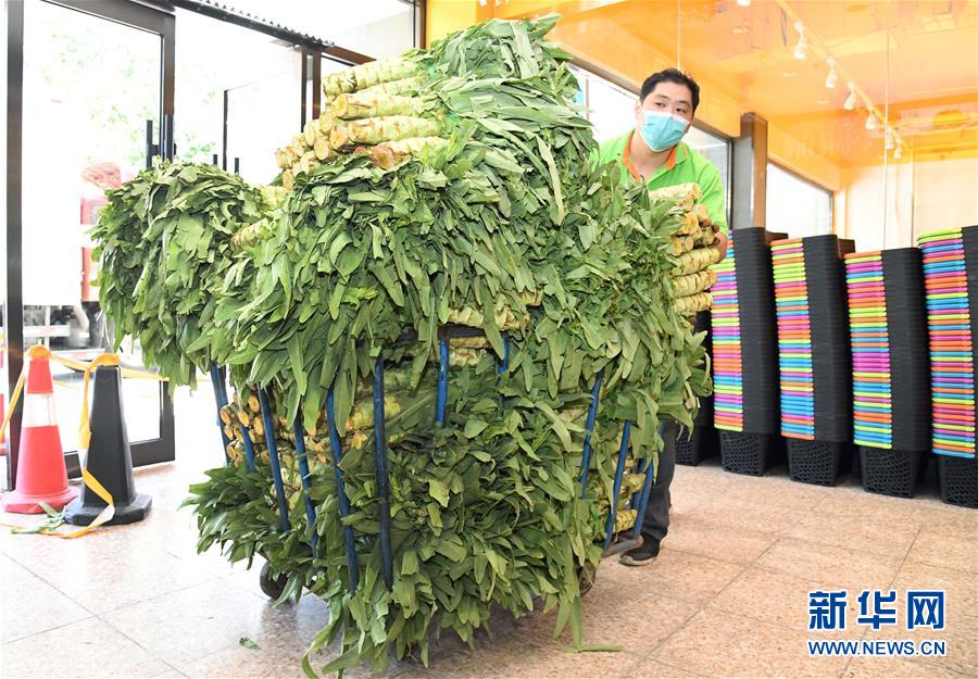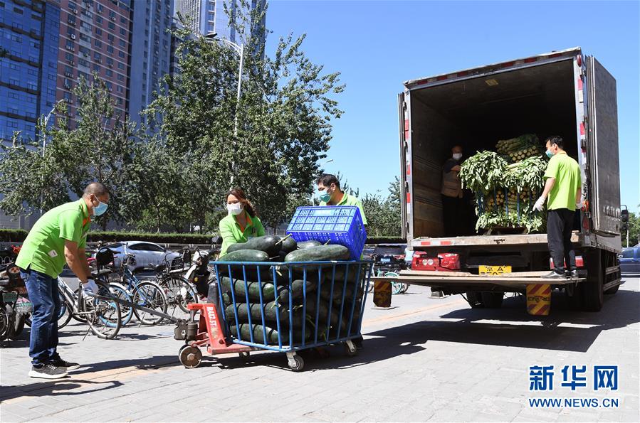 6月14日,在北京市海淀區(qū)的超市發(fā)雙榆樹店門口,工作人員在搬運蔬菜。 新華社記者 任超 攝