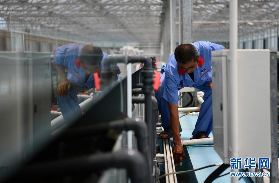 在天津現(xiàn)代晨輝科技集團有限公司的養(yǎng)殖示范場,工人在調(diào)試設備(6月15日攝)。新華社記者 李然 攝