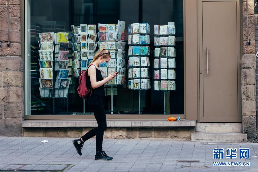 6月13日,一名戴口罩的女子走在比利時布魯塞爾街頭。新華社記者 張鋮 攝