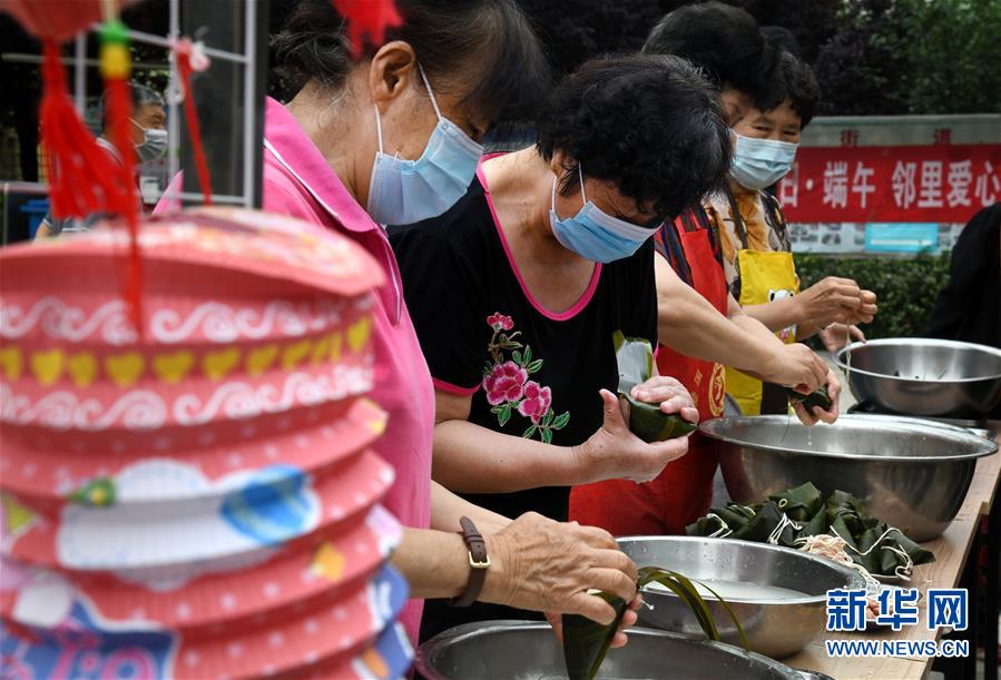 6月17日,水清溝街道居民在社區(qū)廣場(chǎng)上包粽子。當(dāng)日,青島市北區(qū)水清溝街道開(kāi)展迎端午鄰里愛(ài)心傳遞進(jìn)網(wǎng)格活動(dòng),居民通過(guò)包粽子、吃粽子、網(wǎng)上端午傳統(tǒng)文化課等形式傳遞鄰里愛(ài)心,傳承民俗文化。新華社記者 李紫恒 攝