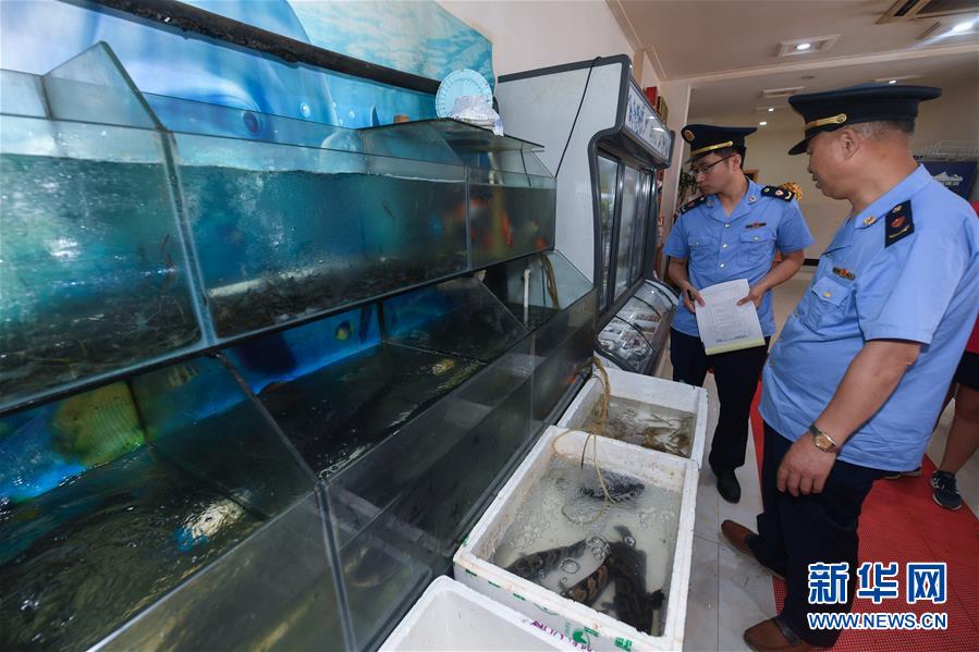 6月17日,市場(chǎng)監(jiān)管執(zhí)法人員在東林鎮(zhèn)農(nóng)貿(mào)市場(chǎng)開展專項(xiàng)執(zhí)法行動(dòng),檢查是否存在非法銷售野生動(dòng)物的情況。新華社記者 徐昱 攝