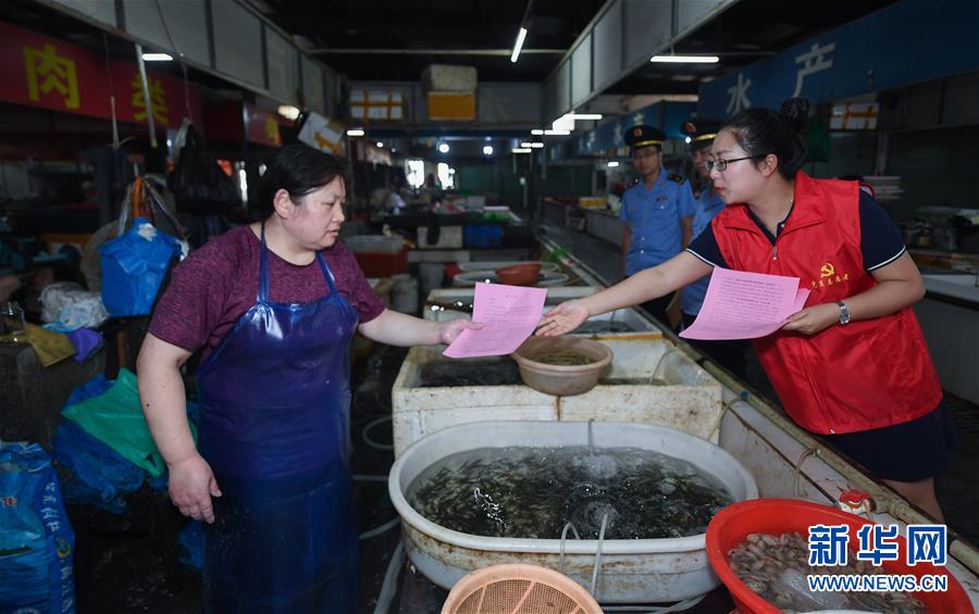 6月17日,黨員志愿者(右一)在東林鎮(zhèn)農(nóng)貿(mào)市場(chǎng)給經(jīng)營(yíng)戶發(fā)放野生動(dòng)物保護(hù)及禁食倡議書。新華社記者 徐昱 攝