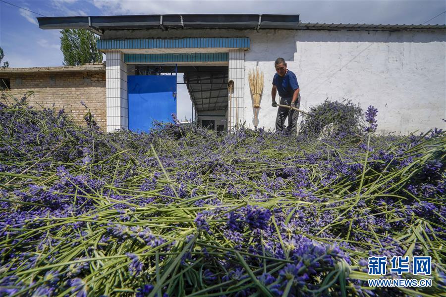 霍城縣蘆草溝鎮(zhèn)四宮村的村民馬英國(guó)在家門(mén)口晾曬薰衣草干花(6月16日攝)。新華社記者 趙戈 攝