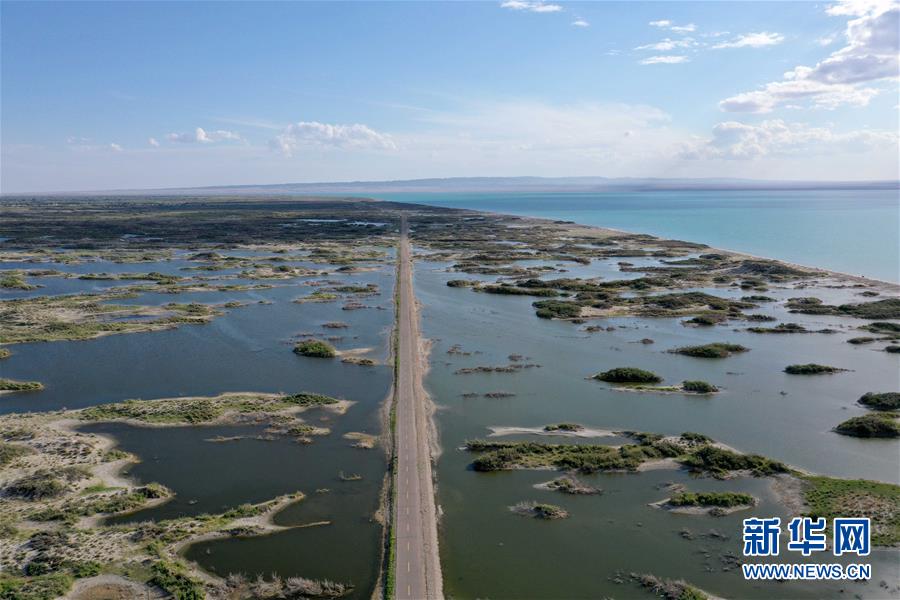 6月18日拍攝的新疆烏倫古湖國家濕地公園(無人機(jī)照片)。烏倫古湖國家濕地公園位于新疆阿勒泰地區(qū)福??h城以西,由烏倫古湖和吉力湖兩部分組成。烏倫古湖濕地公園是遷徙候鳥飛越天山和阿爾泰山的“能量補(bǔ)充站”,良好的濕地生態(tài)吸引著大量遷徙鳥類在此集結(jié)成群,繁殖棲息,成為一道靚麗的風(fēng)景線。新華社記者 沙達(dá)提 攝