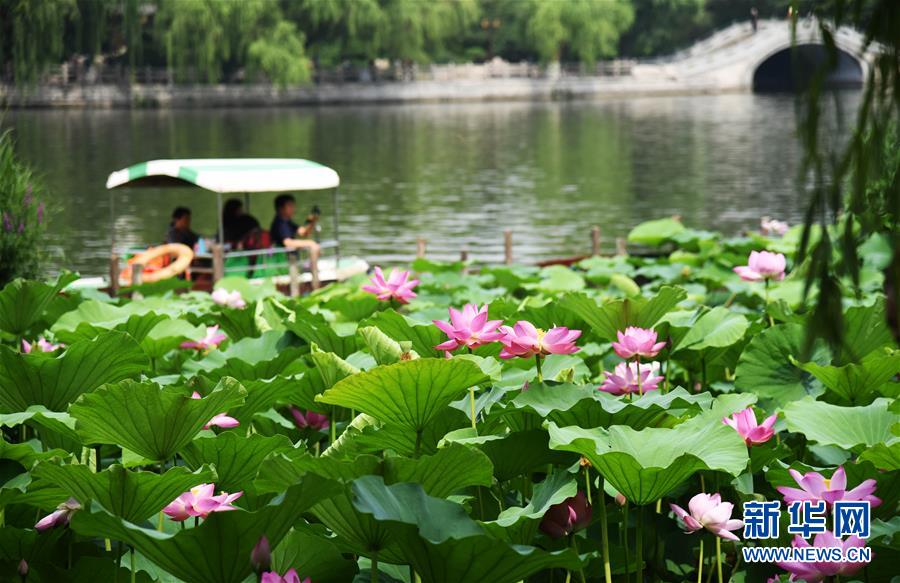 6月19日,市民在大明湖畔欣賞荷花。近日,山東濟南大明湖的荷花陸續(xù)綻放,吸引游客前來觀賞。新華社記者 王凱 攝