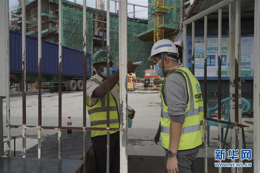 6月21日,在斯里蘭卡首都科倫坡,一名工人在中國港灣科倫坡房建項(xiàng)目工地門口接受體溫檢測(cè)。新華社記者唐璐攝