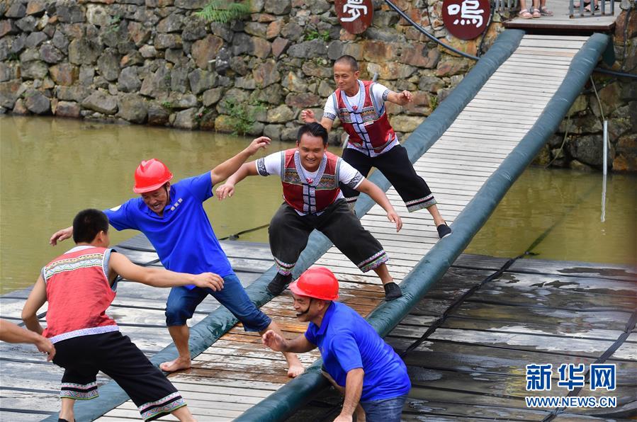 在廣西融水雙龍溝森林旅游度假區(qū)夢嗚苗寨,幾位搬遷戶協(xié)助游客挑戰(zhàn)“搖擺橋”(6月21日攝)。近年來,融水打造原生態(tài)苗族文化體驗園——夢嗚苗寨,讓搬遷進城的貧困戶住進復原建設(shè)的老房子。景區(qū)提供綠化保潔、游樂設(shè)施管理、民族歌舞表演等工作崗位,多渠道增加貧困戶收入。