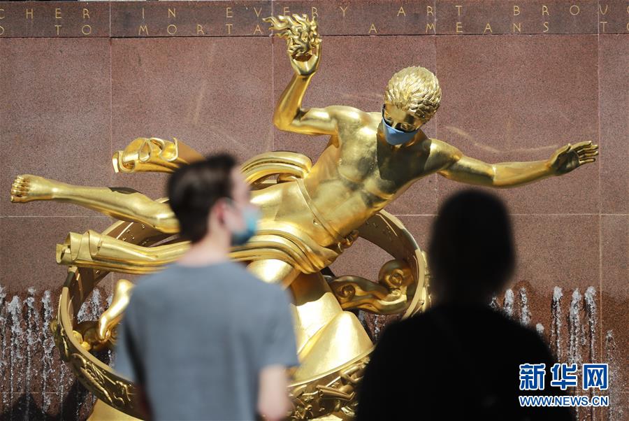 6月22日,在美國(guó)紐約洛克菲勒中心,一座雕像被“戴”上口罩。美國(guó)約翰斯·霍普金斯大學(xué)22日發(fā)布的新冠疫情最新統(tǒng)計(jì)數(shù)據(jù)顯示,美國(guó)累計(jì)死亡病例超過(guò)12萬(wàn)例。新華社記者王迎攝