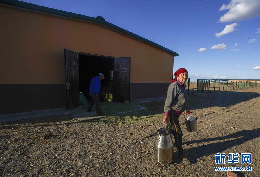 在吉木乃縣萬駝園內(nèi),一位牧民將剛收集的駱駝奶交到收奶處(6月21日攝)。新華社記者趙戈攝