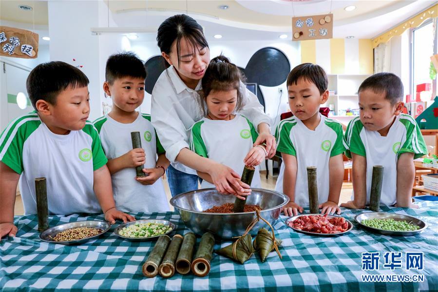 6月23日,長(zhǎng)興縣李家巷鎮(zhèn)中心幼兒園的孩子們?cè)诶蠋煹膸ьI(lǐng)下,一起學(xué)習(xí)制作端午粽子和竹筒飯。為了迎接即將到來(lái)的端午節(jié),浙江省湖州市長(zhǎng)興縣各個(gè)幼兒園開(kāi)展“品民俗迎端午”主題活動(dòng),讓小朋友們體驗(yàn)傳統(tǒng)民俗文化。新華社記者徐昱攝