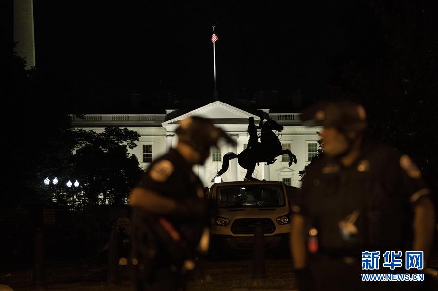 6月22日,警察在美國華盛頓白宮附近警戒。美國警察和示威者22日晚在首都華盛頓市白宮北側(cè)拉斐特廣場發(fā)生沖突并對峙。美國總統(tǒng)特朗普在社交媒體上說,許多人因破壞廣場上美國前總統(tǒng)安德魯·杰克遜的雕像及附近圣約翰圣公會教堂被逮捕。新華社記者劉杰攝