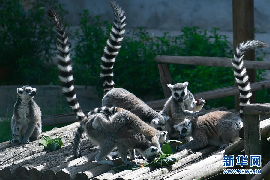 6月25日,在青海省西寧野生動物園,一群環(huán)尾狐猴在享用小朋友們包的粽子。新華社記者 張龍 攝