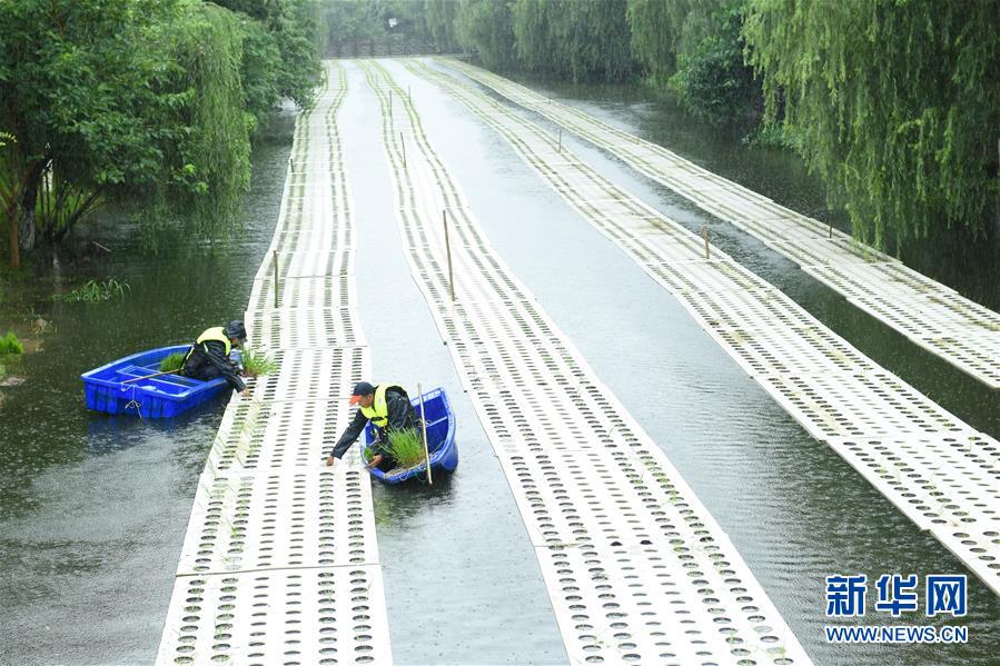 6月29日,工作人員在吳興區(qū)湖東街道的“水上稻田”插秧。今年以來(lái),浙江湖州吳興區(qū)湖東街道開(kāi)始在轄區(qū)河道大規(guī)模推廣“水上稻田”新型農(nóng)業(yè)項(xiàng)目,利用浮島進(jìn)行特種水稻種植,既能凈化水體,又能產(chǎn)出生態(tài)稻谷?!八系咎铩鳖A(yù)計(jì)在11月實(shí)現(xiàn)收割。新華社記者翁忻旸攝