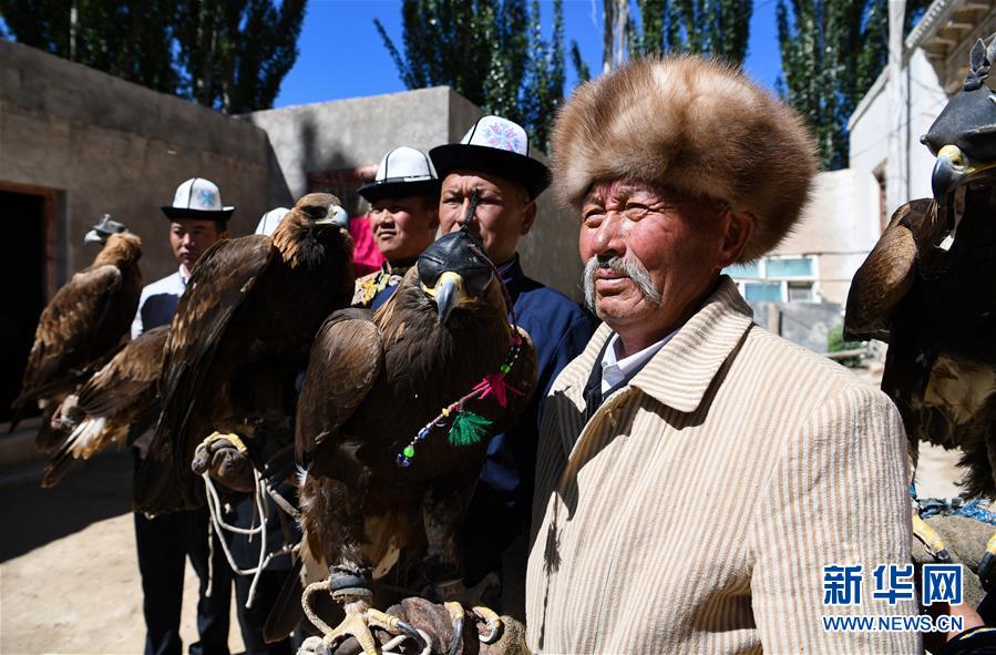 6月29日,庫(kù)爾馬西·胡特曼(右)和他的徒弟們展示獵鷹。新華社記者宋彥樺攝