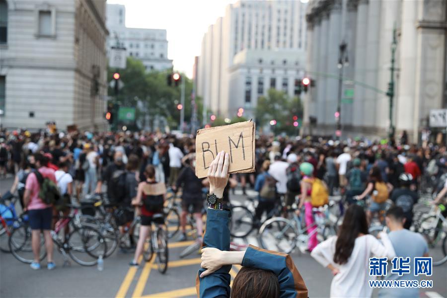 6月30日,一名抗議者在美國紐約市政廳附近手舉寫有“黑人的命也是命”縮寫的標(biāo)語參加抗議活動(dòng)。由美國明尼蘇達(dá)州明尼阿波利斯市非裔男子弗洛伊德遭白人警察暴力執(zhí)法而死一事引發(fā)的各種抗議活動(dòng)仍在紐約持續(xù)進(jìn)行。新華社記者王迎攝