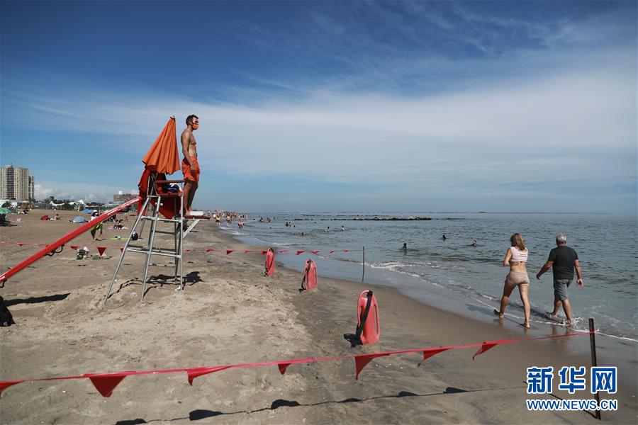 7月1日,救生員在美國紐約科尼島的一處海灘查看海面情況。當(dāng)日,美國紐約市屬八處海灘正式重新準許民眾游泳,救生員也同時上崗。新華社記者王迎攝