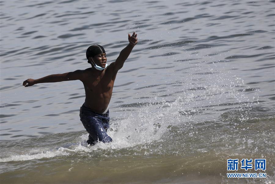 7月1日,一名少年在美國紐約科尼島戲水。當日,美國紐約市屬八處海灘正式重新準許民眾游泳,救生員也同時上崗。新華社記者王迎攝