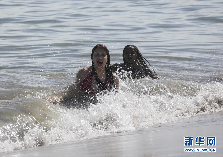 7月1日,人們?cè)诿绹~約科尼島戲水。當(dāng)日,美國紐約市屬八處海灘正式重新準(zhǔn)許民眾游泳,救生員也同時(shí)上崗。新華社記者王迎攝