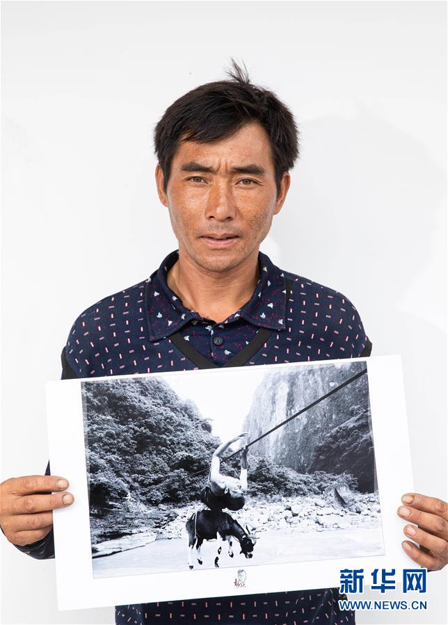 且沙次干手捧自己背羊過溜索的老照片在新居門前留影(6月30日攝)。新華社記者 江宏景 攝