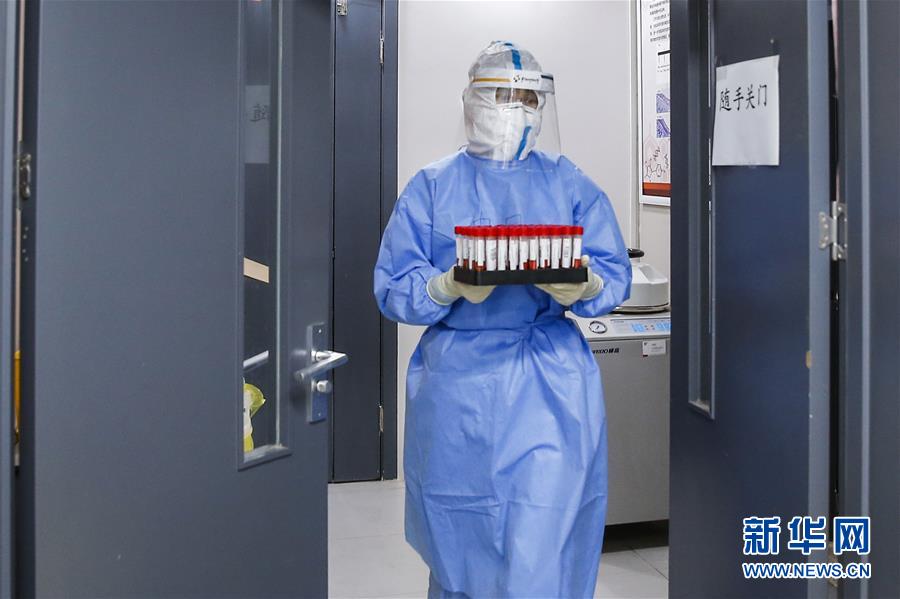 7月3日,中日友好醫(yī)院檢驗(yàn)科新冠核酸檢測(cè)實(shí)驗(yàn)室的檢驗(yàn)人員閆克芹運(yùn)送經(jīng)過(guò)滅活的樣本。新華社記者張玉薇攝