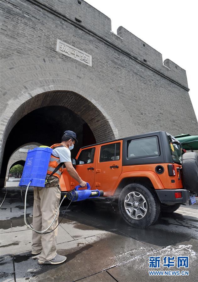 7月4日,防疫人員對(duì)進(jìn)入宛平古城的車輛進(jìn)行消毒。當(dāng)日,北京市豐臺(tái)區(qū)組織防疫人員、安全監(jiān)察部門人員對(duì)社區(qū)、超市、公共場(chǎng)所進(jìn)行大規(guī)模環(huán)境消毒及疫情隱患排查,全力保障市民生活和工作環(huán)境安全。新華社記者 李欣 攝