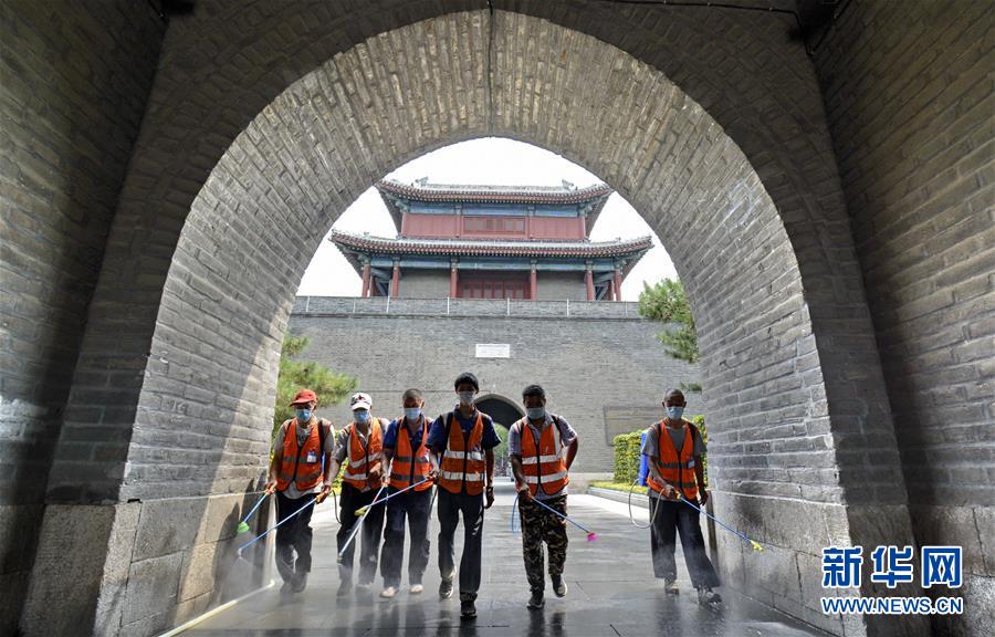 7月4日,防疫人員在宛平古城進行環(huán)境消毒。當日,北京市豐臺區(qū)組織防疫人員、安全監(jiān)察部門人員對社區(qū)、超市、公共場所進行大規(guī)模環(huán)境消毒及疫情隱患排查,全力保障市民生活和工作環(huán)境安全。新華社記者 李欣 攝