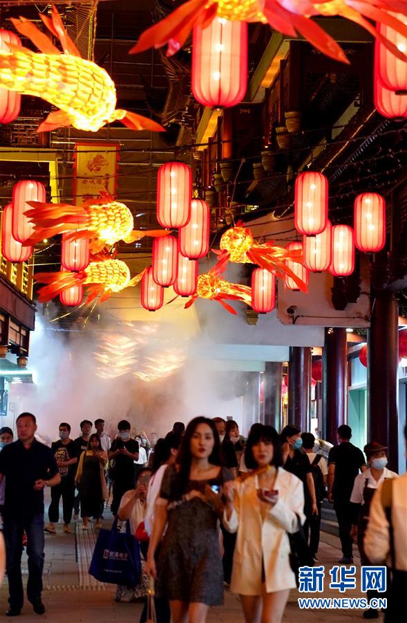 7月3日在上海豫園拍攝的燈景。從7月第一個(gè)周末起,上海豫園原有的“豫園六點(diǎn)半”集市全面升級(jí),煥彩燈光、演藝活動(dòng)和花車集市全線更新,讓市民和游客在觀燈、觀人、觀演的沉浸式體驗(yàn)中,享受夏日特色的“食玩”樂(lè)趣。新華社記者 劉穎 攝