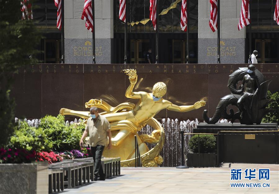 7月4日,一名男子從美國紐約洛克菲勒中心一尊戴口罩的雕像前走過。當日是美國獨立日,美國多地疫情仍面臨嚴峻形勢。美國約翰斯·霍普金斯大學實時統(tǒng)計數(shù)據(jù)顯示,美國累計新冠確診病例4日已超過280萬例。新華社記者王迎攝