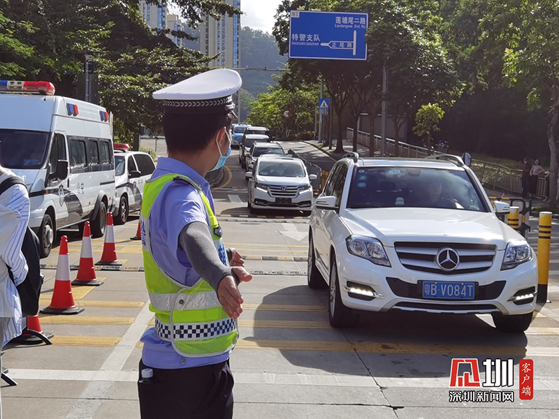 紅嶺中學(xué)考點(diǎn)門口正在指揮車輛通行的交警。