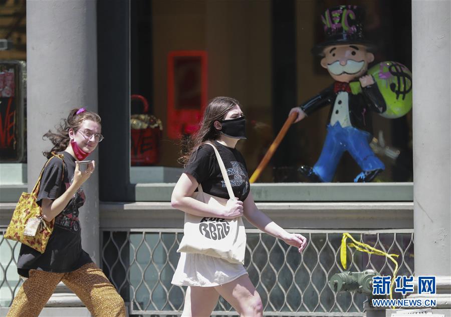 7月6日,佩戴口罩的行人走過美國(guó)紐約的一家糖果店。新華社記者王迎攝