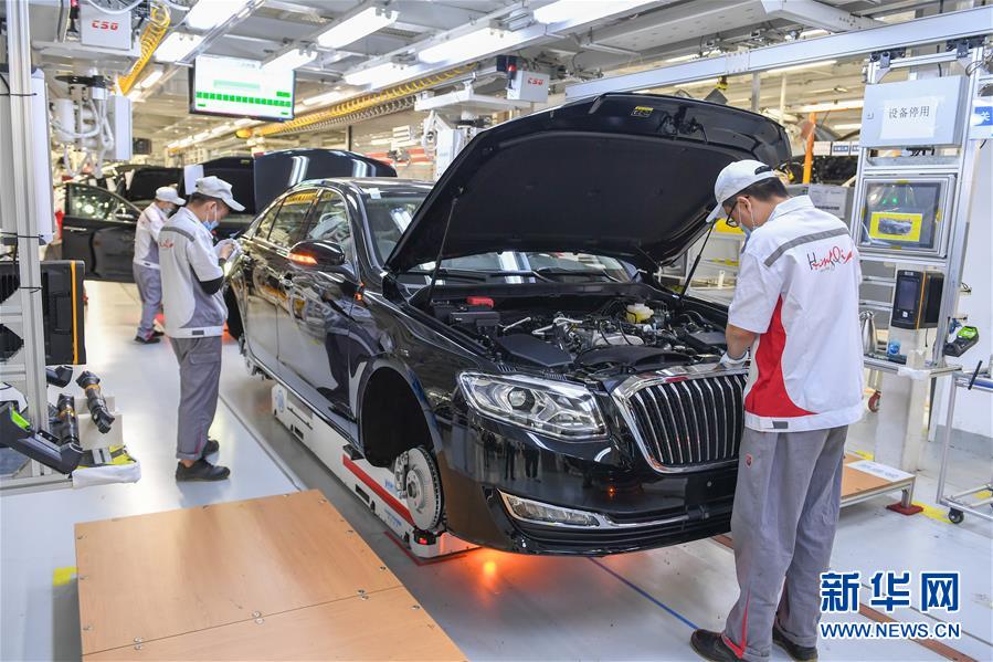 在位于長春市的一汽紅旗總裝車間,工人在裝配車輛(6月19日攝)。中國第一汽車集團披露,截至6月30日,集團上半年共計生產整車162.23萬輛,同比增長1.5%;銷售整車163.09萬輛,同比增長2.3%。新華社記者張楠攝
