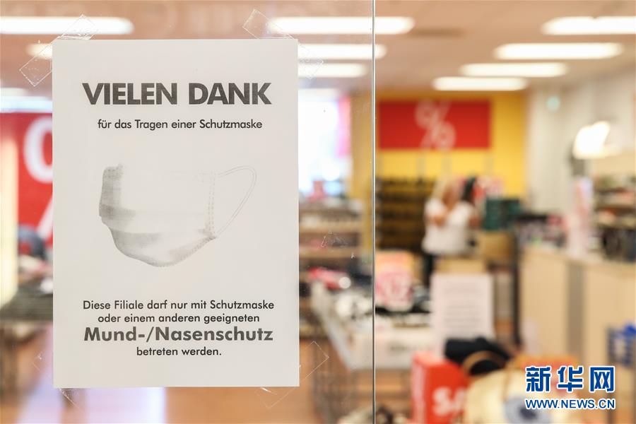 這是7月7日在德國首都柏林拍攝的一間商鋪張貼著提示顧客佩戴口罩的告示。針對有地方官員呼吁取消民眾乘坐公交車和在商場購物時(shí)須戴口罩的規(guī)定,德國聯(lián)邦政府6日表示,支持延續(xù)“口罩強(qiáng)制令”。4月底,德國全部16個(gè)聯(lián)邦州陸續(xù)出臺“口罩強(qiáng)制令”,即居民在乘坐公交車和購物時(shí)須佩戴口罩。新華社記者單宇琦攝