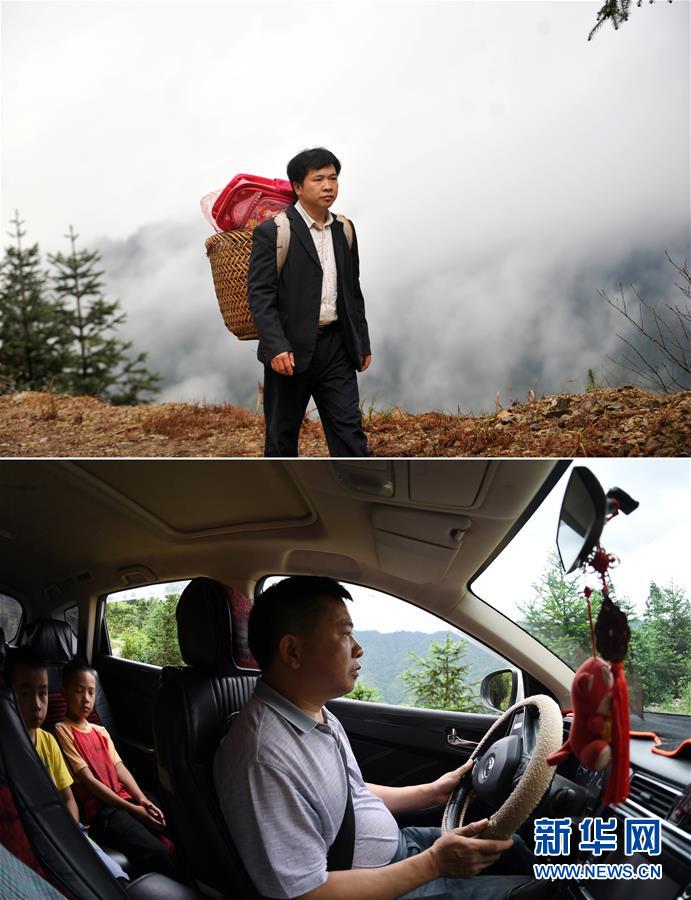 這是一張拼版照片,上圖:在廣西龍勝龍脊鎮(zhèn)江柳村,余啟貴老師背著背簍走在去學(xué)校的路上(2013年2月26日攝);下圖:在廣西龍勝龍脊鎮(zhèn)江柳村,余啟貴老師開(kāi)著自己的汽車帶著學(xué)生去學(xué)校(7月7日攝)。新華社記者陸波岸攝
