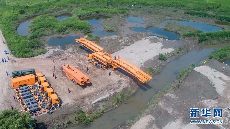 7月10日,工作人員在演練現(xiàn)場搭建機(jī)械化橋梁(無人機(jī)照片)。當(dāng)日,由吉林省交通運(yùn)輸廳主辦的公路橋梁水毀搶通應(yīng)急演練在長春市雙陽區(qū)雙陽河舉行,參與演練人員從汛情水毀信息報(bào)送、應(yīng)急裝備快速集結(jié)、機(jī)械化橋梁搶通搭設(shè)、善后處理等方面進(jìn)行實(shí)戰(zhàn)演練。新華社記者張楠攝