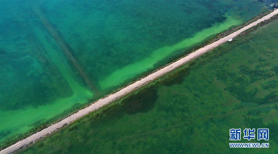 7月10日拍攝的青海湖風(fēng)光(無(wú)人機(jī)照片)。盛夏時(shí)節(jié),被譽(yù)為“中國(guó)最美湖泊”的青海湖畔景色宜人,藍(lán)天、白云、湖水與草原組成一幅壯美的畫(huà)卷。新華社記者張宏祥攝
