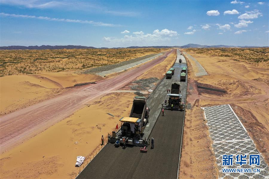 7月10日,位于寧夏境內(nèi)的烏瑪高速青銅峽至中衛(wèi)段A10標(biāo)段在施工中(無人機(jī)照片)。盛夏時(shí)節(jié),位于寧夏境內(nèi)的烏瑪(內(nèi)蒙古烏海市至青?,斍呖h)高速青銅峽至中衛(wèi)段正在抓緊施工建設(shè)。該路段主線全長(zhǎng)122.9公里,其中穿越騰格里沙漠腹地的18公里公路是寧夏建設(shè)的首條沙漠高速公路,預(yù)計(jì)2021年建成通車。新華社記者馮開華攝。
